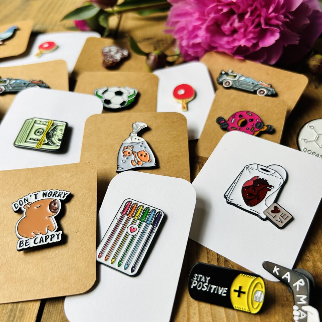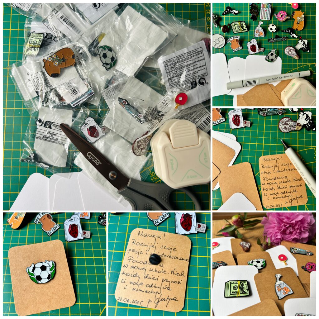 Moi wychowankowie w tym roku kończą pobytu w placówce i zamówiłam im te przypinki między innymi pod ich zainteresowania. Z tyłu na karteczce coś im od siebie napisała.