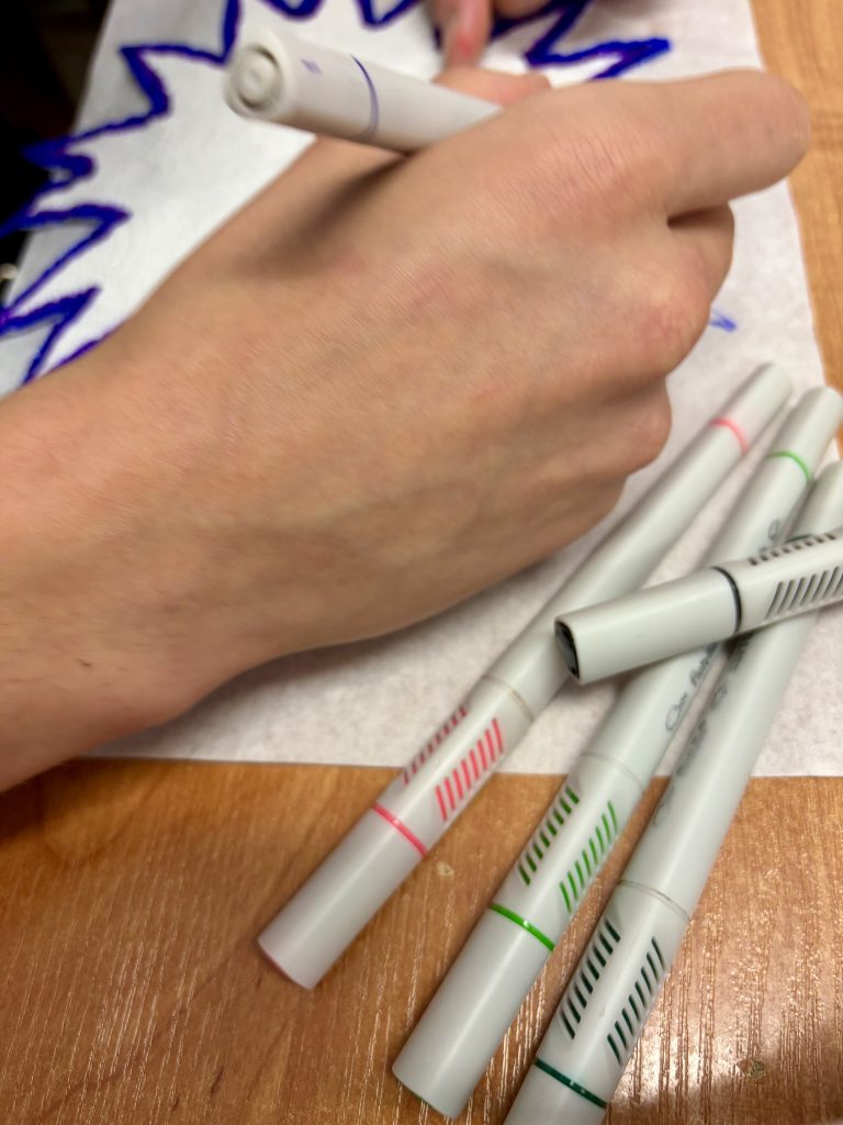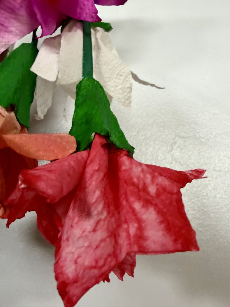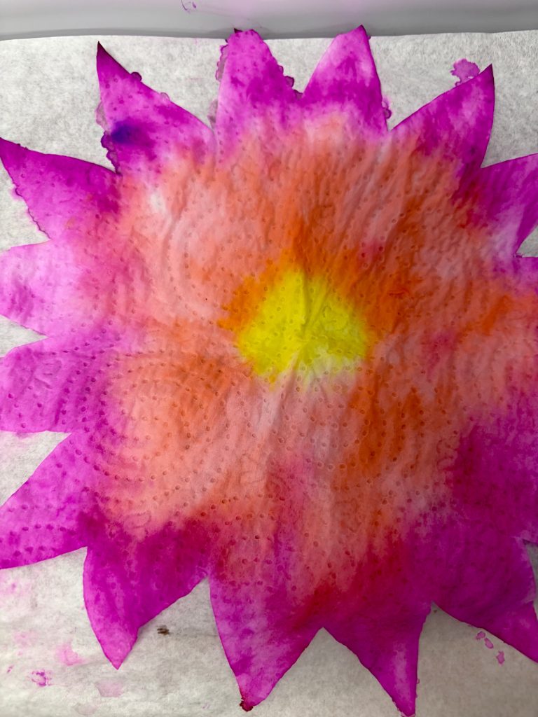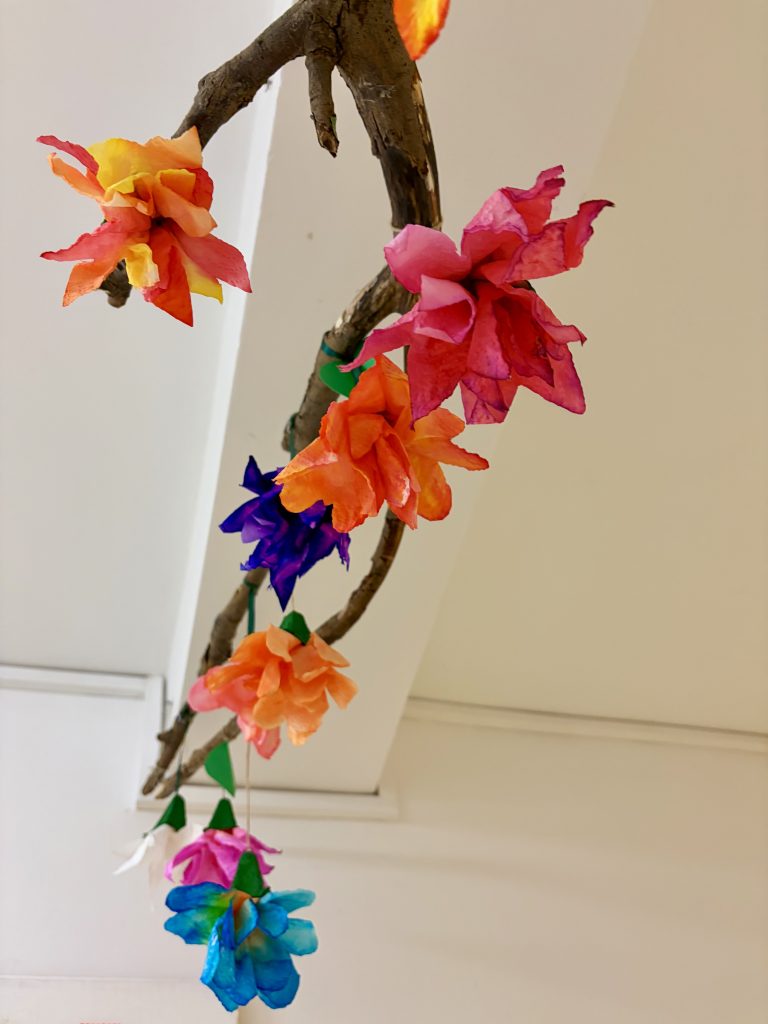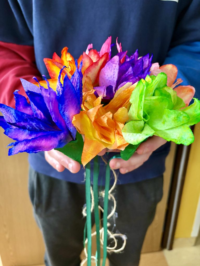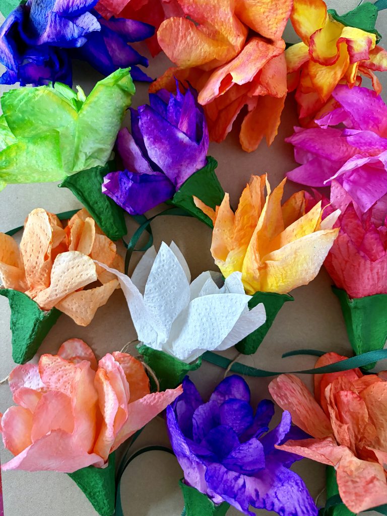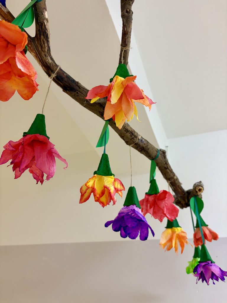 Z ręczników papierowych wycinamy kształt kwiatka. Dziecko maluje, koloruje je, a następnie spryskuje go wodą. Czekamy aż kolory połączą się i kwiat wyschnie. Wycięte wytłaczanki malujemy farbą i wklejamy do niego kwiaty. Na sam koniec dodajemy wstążkę lub sznurek i zawieszamy na gałązce. Moi wychowankowie mieli świetną frajdę w malowaniu i doborze kolorów, a jak zobaczyli efekt końcowy to krzyknęli „wow”.