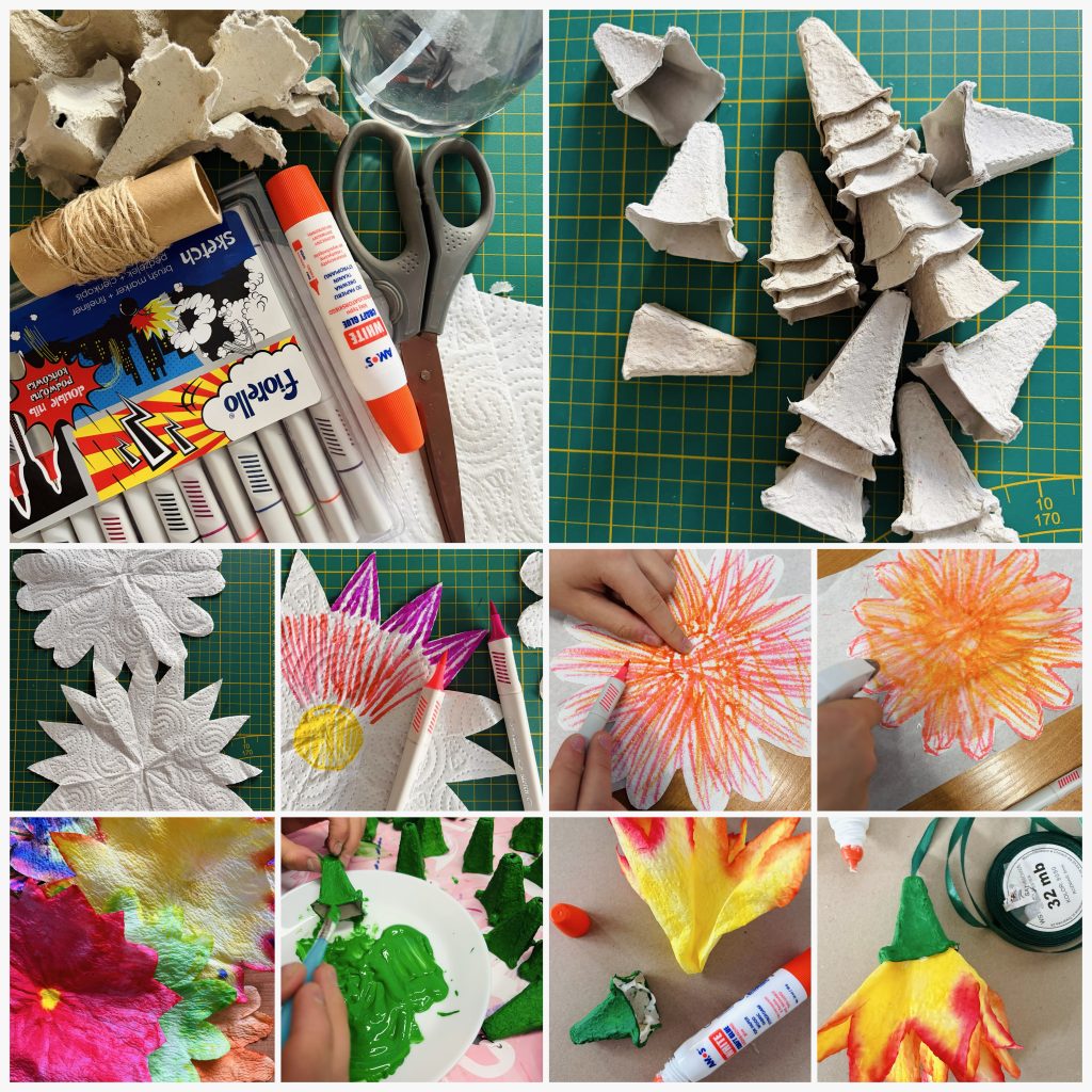 Do wykonania kwiatów potrzeba: wytłaczani po jajkach, zieloną farbę, ręczniki papierowe, flamastry, wodę, klej, szczurek lub wstążkę oraz nożyczki.